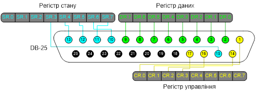 З’єднання регістрів пам’яті із рознімачем DB-25 показано на рис. 2.