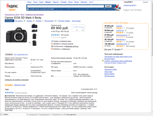 «Яндекс Маркет» – наиболее схожий по функционалу сервис с проектируемым. Даёт возможность посмотреть характеристики оборудования и его фотографии, прочитать отзывы о товаре и магазинах, обсудить оборудование и посмотреть фотографии, сделанные с его помощью. Имеет достаточно удобный расширенный поиск. У магазинов есть возможность автоматически синхронизировать свой каталог с каталогом сервиса (см. рисунок 1). К недостаткам с точки зрения пользователя можно отнести: отсутствие обзоров и статей, пользователи не могут продать своё оборудование, представители магазинов сами добавляются в каталог, у пользователя нет возможности добавить магазин с возможно более низкими ценами, нет сравнения с зарубежными ценами.