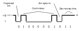 Найбільш широко поширений формат, що включає в себе один стартовий біт, один біт паритету і два стопових біти. Початок пакету даних завжди відмічає низький рівень стартового біта. Після нього слідує 7 біт даних символа коду ASCII. Біт парності містить 1 або 0 так, щоб загальне число одиниць в 8 битной групі було непарним. Останнім передаються два стопових біти, представлених високим рівнем напруження. Еквівалентний ТТЛ сигнал при передачі букви А показаний на рис. 3.