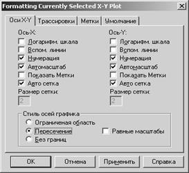 В этом окне 1.на Вкладке Ось X - Y установитьпереключатель Пересечение 2.на Вкладке Трассировки можно установить цвет и толщину линии |