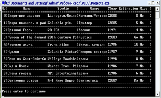 Курсовая работа состоит из введения, трех частей, заключения, списка литературы, содержащего 7 источников. Содержит 53 страницы, 10 рисунков, 2 приложения, введение, заключение. Во введении описывается современное состояние развития объектно-ориентированного программирования и предпосылки создания баз данных. В первой части описаны основные принципы объектно-ориентированного программирования, типичные среды программирования и особенности языка С++, основы алгоритмизации. Во второй части рассмотрен основной метод решения данной задачи. В третьей части приводится описание программы и результаты, получаемые пользователем при использовании данной программы. В заключении подводится итог проделанной работы и дается критический анализ полученных результатов. Приложение содержит текст программы на языке C++, который реализует создание базы видеофильмов.