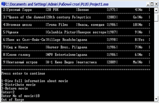 cout<<("Out of Range");//номер не відповідає жодному з фільмів