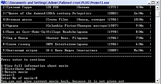 cout<<"You can not receive current movie, because it is in "<<ex.FIO;