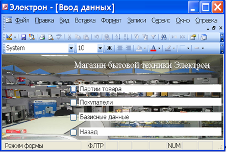 Дана кнопкова форма призначена для введення даних в таблиці (Рис. 4.5) через форми для введення даних (Партії товару, Покупці). Заповнення даних таблиць неможливе без заповнення даними деяких другорядних таблиць, тому створена підлегла кнопкова форма Базисні дані.