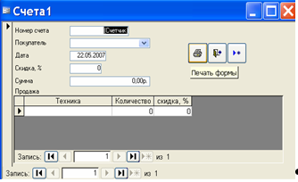 Дана форма (Рис. 4.7) призначена для введення інформації про рахунки: хто і на яку суму розплатився по рахунку за певне число з певною знижкою і який товар проданий по даному рахунку. На даній формі так само розташовані кнопки додавання запису, виходу з форми і друку даної форми. Для спрощення введення даних використаний Майстер підстановок, що реалізовує вибір номера за допомогою спливаючого списку з набором даних.