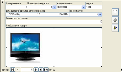 Дана форма (Рис. 4.8) призначена для введення інформації про техніку: Номер техніки - однозначний ідентифікатор товару до БД, Номера виробника (вводиться за допомогою спливаючого списку), Номера назви (вводиться за допомогою спливаючого списку), моделі, дата випуску, термін гарантії, ціна, номер партії (вводиться за допомогою спливаючого списку), кількість на складі - первинна кількість товару на складі, Зображення товару. На даній формі так само розташовані кнопки додавання запису, виходу з форми і друку даної форми.