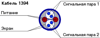 Шесть контактов FireWire подсоединены к двум проводам, идущим к источнику питания, и двум витым парам сигнальных проводов. Каждая витая пара и весь кабель в целом экранированы. Провода питания рассчитаны на ток до 1,5 А при напряжении от 8 до 40 В, поддерживают работу всей шины, даже когда некоторые устройства выключены. Они также делают ненужными кабели питания во многих устройствах. Не так давно инженеры Sony разработали еще более тонкий четырехпроводный кабель, в котором отсутствуют провода питания. (Они намерены добавить свою разработку к стандарту.) Этот так называемый AV-разъем будет связывать небольшие устройства, как "листья" с "ветками" 1394.