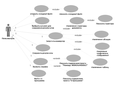 | 1. Прецедент начинается, когда пользователь нажимает кнопку «Запуск конвертирования» | 2. include (извлечение структуры документа) 3. include (извлечение абзацев) 4. include (извлечение графических изображений) 5. include (извлечение таблиц) 6. На этом прецедент заканчивается |