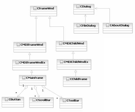 Класс, непосредствено связанный с отображением дочерних окон MDI, называется CChildFrame, и он наследуется от базового класса CMDIChildWnd, определенного в библиотеке MFC. Объекты класса представляют дочерние окна MDI главного окна приложения. Внутри этих окон отображаются окна просмотра документов.