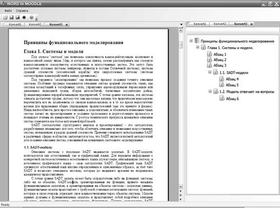 Система конвертирования контента использует расширенный интерфейс MDI-приложений. В Microsoft Visual Studio 2008 появилась возможность отображать окна не в виде каскада, как было ранее, а используя современную более удобную технологию – вкладки. Для этого используются классы CMDIFrameWndEx и CMDIChildWndEx. Пользователь имеет возможность одновременно работать с несколькими документами, переключаясь между ними нажатием на вкладки.