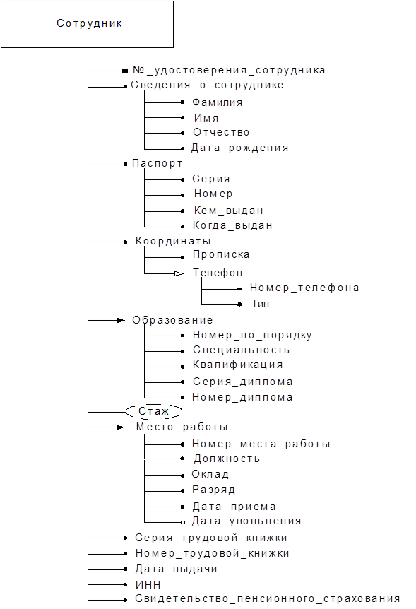 Явные связи типа «многие ко многим» устранены путем замены их одноименной сущностью с копированием идентификаторов связываемых сущностей в состав атрибутов для сохранения неявных связей. В результате появились новые сущности: «Координаты», «Место работы», «Карьера».