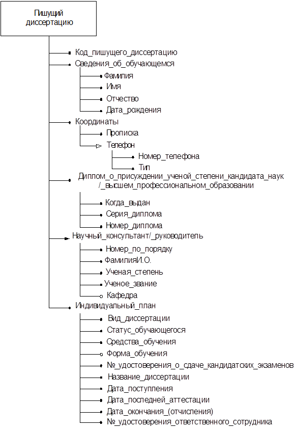 Категория обобщающей сущности «Пишущий диссертацию» устранена путем выделения в отдельную сущность категории «Диссертант», имеющей собственные атрибуты.