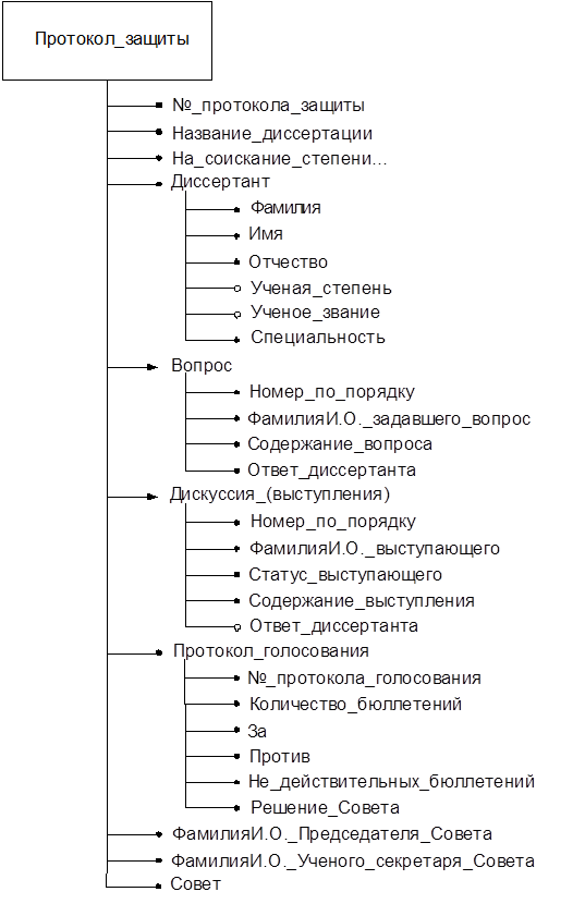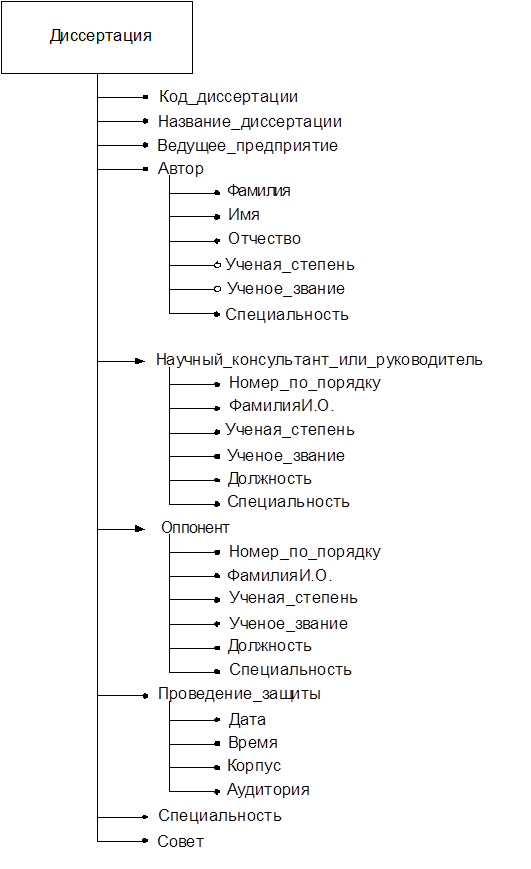 Явные связи типа «один ко многим» заменены неявными путем копирования атрибутов-идентификаторов родительской сущности в множество атрибутов дочерней сущности. Такое копирование произведено для сущностей «Диплом», «Научный консультант/ руководитель», «Член экзаменационной комиссии», «Экзаменационный вопрос», «Оппонент», «Выступление», «Вопрос на защите».