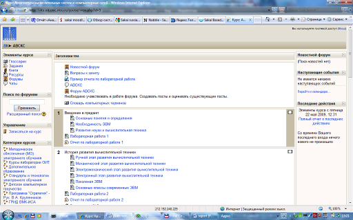 Затем в системе были заведены тестовые пользователи, а также добавлен курс по анализу информационных технологий. Перечень инструментов, с помощью которых было осуществлено информационное наполнение ресурса следующий: Объявления, Задания, Форумы, Ресурсы, Тесты.