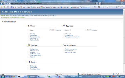 Claroline (CLAssROomonLINE) [5] – платформа, предназначенная для построения сайтов электронных курсов. Это монолитная система, требующая установки PHP, MySQL, Apache и поддерживающая спецификации IMS/SCORM. Claroline разрабатывается в Бельгии и поддерживает более трех десятков языков, в том числе и русский. Так выглядит демонстрационная версия сайта.