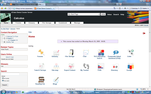 ATutor [4] – канадская свободно распространяемая модульная система на базе PHP и MySQL. Присутствует поддержка IMS/SCORM, а также русскоязычных текстов. Основная задача, которая была поставлена перед разработчиками эта легкость установки, настройки и работы с системой.
