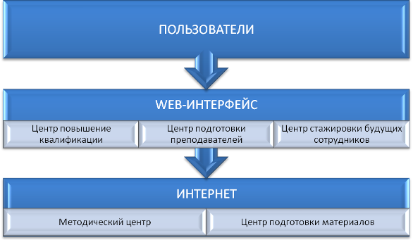 Подобный виртуальный образовательный отдел должен включать в себя основной набор средств центра электронного обучения, для переноса процесса образования на дистанционные основы, что в будущем позволит легко адаптироваться к более масштабному внедрению процесса электронного обучения.