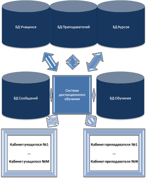 Система содержит несколько баз данных, которые хранят некоторую специализированную информацию: данные об учащихся и преподавателях, материалы для учебно-методических курсов, различные сообщения о событиях в системе (в их число можно включить личные сообщения внутри системы) и данные о процессе обучения.
