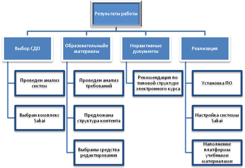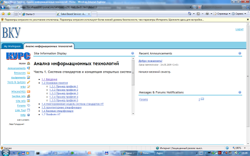 После проведенных исследований и построения этой модели, на ее основе и с использованием возможностей системы Sakai был реализован макет виртуального корпоративного университета. В систему был загружен пробный учебный курс по анализу информационных технологий для демонстрации возможности полученного решения.
