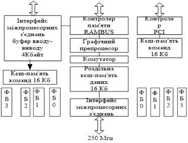 Крім функціональних блоків і кєшів команд (16 Кб) на кристалі розташовані: загальний для процесорів кєш даних (16 Кб), контролер PCI, контролер Rambus - пам'яті, графічний препроцесор, 64-розрядні високошвидкісні інтерфейси для між процесорних з'єднань і підключення графічної підсистеми, а також комутатор, об'єднуючий процесори і всю решту компонентів кристала.