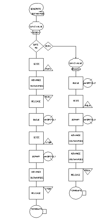 Поставлена задача зважується за допомогою системи імітаційного моделювання GPSS. Алгоритмічна мова GPSS є мовою моделювання, орієнтованим на побудову моделей систем з дискретними процесами і виконання моделювання на ЕОМ. ДО таких систем відносяться СМО довільної структури: транспортні вузли і транспортні системи, інформаційні системи, технологічні процеси. деякі підприємства і т.д. Мова GPSS розрахована на широке коло користувачів, що застосовують метод статистичного моделювання для проектування і дослідження складних систем в умовах АСУ.