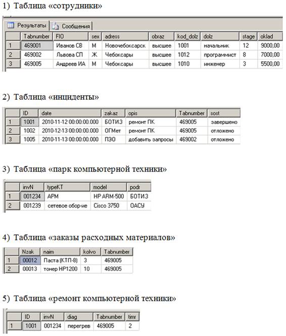В результате анализа предположительного функционирования гипотетической автоматизированной системы были выбраны пять автоматизируемых функций, охватывающих управление и организацию кадров, инциденты, ремонт техники и заказ комплектующих, информационное обеспечение которых соответствует пяти объектам предметной области и включает 25 атрибутов.