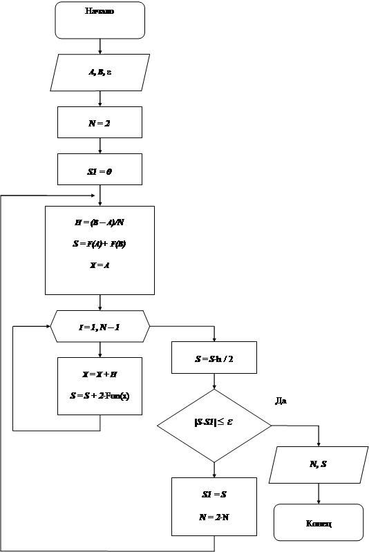 По блок-схеме была создана программа для вычисления интеграла методами Симпсона и трапеций: