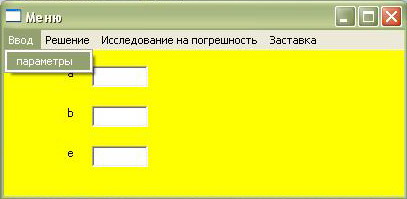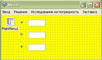 Запускаем программу. С помощью компонента MainMenuвыберем вкладки "Ввод", "Решение", "Исследование" и "Заставка".