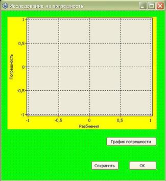 · Три кнопки: Кнопка "График погрешности" визуализирует сравнение методов; Кнопка "Сохранить" сохраняет результаты сравнения в текстовый файл; Кнопка "OK" - принимает данные и возвращается на главное меню;