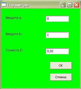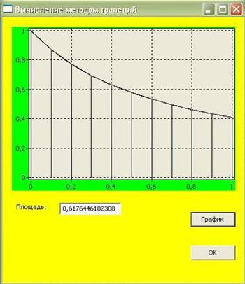 · Две кнопки: "График" - визуализирует метод трапеций; "OK" - принимает данные и возвращается на главное меню;