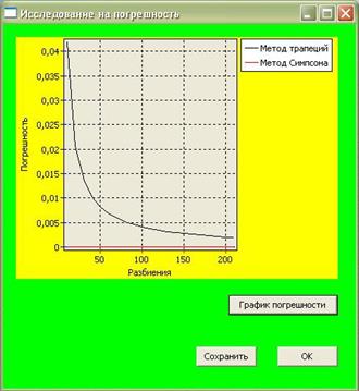 Аналогично выглядит форма, когда вычисляем площадь по методу Симпсона (парабол). Далее выбираем вкладку "Исследование на погрешность" открывается Form5, нажимаем на кнопку "График", затем на кнопку "Сохранить"