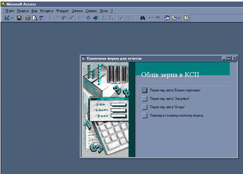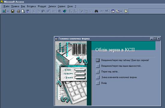 Для роботи з системою необхiдно завантажити у Windows-95 через кнопку “Пуск” СУБД Access та відкрити в ньому базу “Облік зерна в КСП”. Після завантаження програмного засобу на екрані монітора виникає головна кнопочна форма бази даних з інтуїтивно зрозумілим інтерфейсом. В ній сконценровані всі наявні функції програмного засобу, а також кнопка “Вихід”.