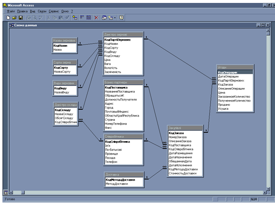 2. Структурну схему 2 , на якiй покажемо всiiмена об’єктiв (таблиць, форм, запитів, звітів), що необхідно створити,та тiльки тi зв'язки мiж ними, якiмають існувати насправдi. Структурна схема 2 проілюстрована рис.4 схеми бази даних зернових КСП. Ця схема служить основою програмного засобу, що проектується.