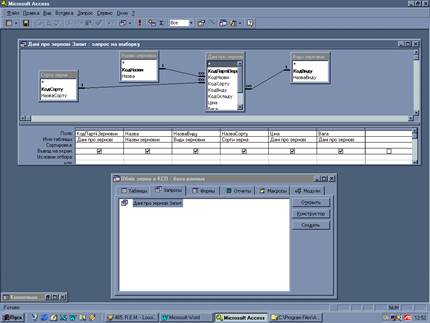 Реалізація задачі здійснюється за допомогою засобів, орієнтованих на користувача. Дляцього в програмному засобі сконструйовані таблиці, запити, екранні форми, звіти. Екранні форми введення і редагування даних відповідають структурі первинних документів. В Додатках в надрукованому виглядi представлені зразки екраннихформ (рис. 5, 6, 7) та макетів звiтів (рис. 8, 9, 10). На рис.10 та 11 представлено запит по зерновим у вигляді конструктора та результата запиту.