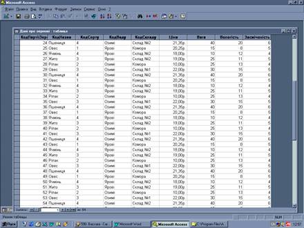 1. Спроектувати та побудувати на основi СУБД Accessiнформацiйно-довiдкову систему обліку зернових в приватному сільськогосподарському підприємстві у виглядi бази даних та засобів її супроводу (пiдтримки). База даних має мiстити мiнiмум 50 записiв (в головній таблиці). Система повинна виконувати операцiї