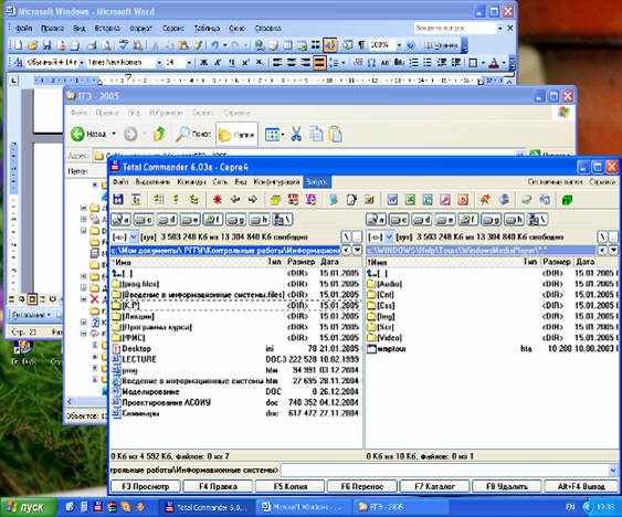 Рисунок 8. Окна Windows. Открыто окно приложения Microsoft Word, окно папки "ЕГЭ-2005", активно окно приложкения Total Commander 6.03a