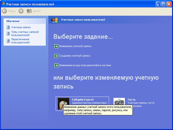 В современных системах Windows можно сохранять индивидуальную рабочую среду для каждого пользователя (см. рисунок 13).