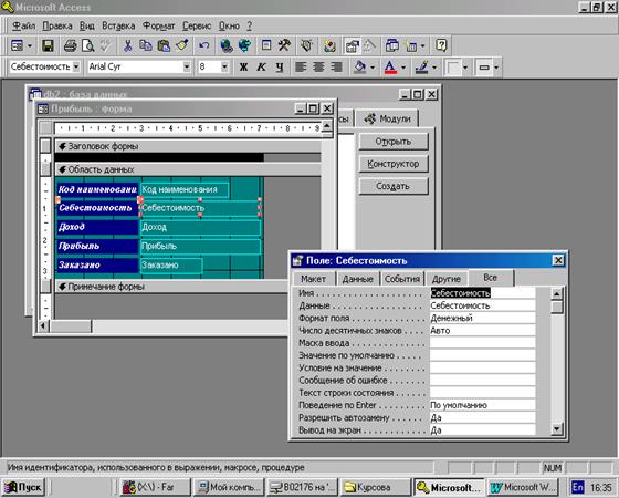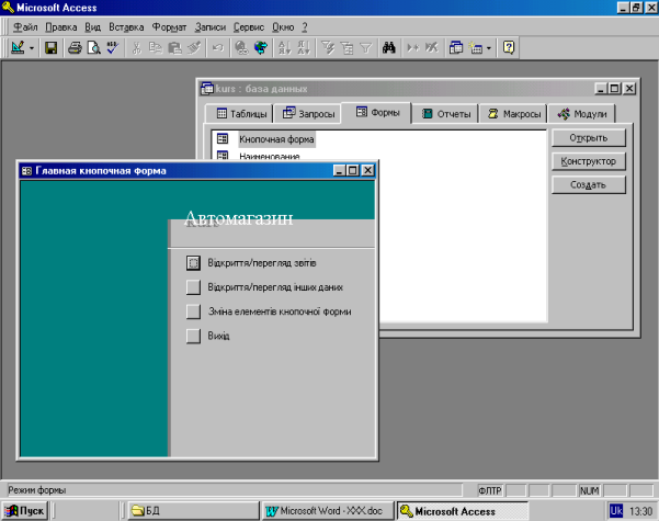 Окремi задачi створеної бази даних вирiшенi у виглядi запитiв, звiтiв та програмних модулів на мовi Visual Basic for Application. Всi розробленi компоненти бази даних поєднанi в єдиний програмний засiб за допомогою головної кнопочної форми сучасного Windows-дизайну. У випадку впровадження результатiв роботи потрiбно звернути увагу на поступове заповнення потрібними даними таблиць-довідників та головних таблиць. Пiд час адаптацiї системи до реального об'єкту необхідно, у разі потреби, додати до головної кнопочної форми додаткові таблиці, форми, запити та звіти.