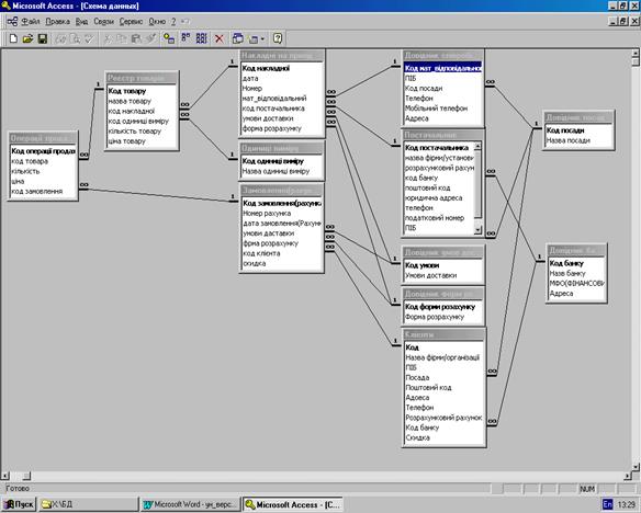 2. Структурну схему 2, на якiй покажемо всi iмена об’єктiв (таблиць, форм, запитів, звітів), що необхідно створити, та тiльки тi зв'язки мiж ними, якi мають існувати насправдi. Структурна схема 2 проілюстрована рис.2 схеми бази даних, що характеризують діяльність досліджуваного підприємства. Ця схема служить основою програмного засобу, що проектується.