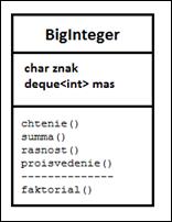 Первым делом была выбрана структура класса больших целых чисел. Так как число может быть как положительным, так и отрицательным было введено символьное поле, отвечающее за знак числа «+» или «–». Само число решено было записывать с помощью очереди с двусторонним доступом (deque) – контейнер из стандартной библиотеки шаблонов (STL). Очередь представляет собой динамический массив с множеством стандартных методов для его обработки. «Цифру» каждого разряда большого числа мы будем помещать в соответствующую ячейку массива. Например, число 12345, записанное с помощью deque<int> mas; будет выгледеть как набор элементов этого массива: mas[0] = 1, mas[1] = 2, mas[2] = 3, mas[3] = 4, mas[4] = 5. Также класс будет содержать некоторое количество методов, для решения поставленных задач. Класс будет иметь название BigInteger. Структура класса изображена на рисунке 1.