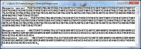 Рис. 2. Ввод-вывод большого положительного и отрицательного числа в консоль