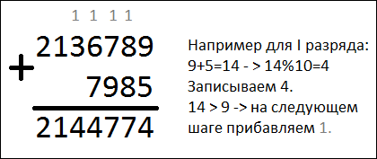 Затем был реализован метод сложения двух больших чисел summa (BigIneger, BigInteger). Сначала метод проверяет знаки переданных ему чисел, если знаки разные, он, немного модифицируя знаки, передает числа методу, вычисляющему разность двух больших чисел, речь о котором пойдет дальше. Если же знаки чисел одинаковые, непосредственно происходит операция их сложения. Принцип основан на сложении «столбиком». Находим «длину» минимального по разрядам числа, затем складываем поразрядно числа в пределах этой «длины», добавляя 1, если сумма на предыдущем шаге была > 9, находим остаток от деления полученного числа на 10 (int% 10) и записываем его в разряд, над которым выполнялась операция. После того, как разряды у одного из чисел закончатся, «добиваем» результирующее число цифрами из оставшихся разрядов большего числа. Естественно, чтобы произвести операцию с первым разрядом, нужно обратиться к последнему элементу нашей очереди массива. Пример сложения представлен на рисунке 3.