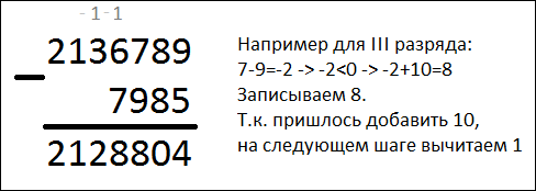 Следующей операцией над большими числами стала операция вычитания, представленная методом rasnost (BigInteger, BigInteger). Вначале метод проверяет знаки переданных ему чисел, если знаки чисел равные (с учетом знака разности), то метод передает числа методу summa (BigInteger, BigInteger). Например, 12 – (-7). Метод передаст 12 и 7 для обработки методу summa (BigInteger, BigInteger). Если знаки чисел разные, то происходит операция вычитания. Принцип основан на вычитании «столбиком». Находим число с меньшим количеством разрядов (меньшей «длиной»), ставим его вторым. И начинаем поразрядно вычитать. При этом, если в разряде первого числа значение больше, чем в разряде второго числа, прибавляем к разности этих чисел 10. Но на следующем шаге вычитаем 1 из следующего полученного результата поразрядного вычитания. Выполняем эти действия, пока не закончатся разряды наименьшего числа, затем «добиваем» результирующее число цифрами из оставшихся нетронутыми разрядов большего числа. Пример вычитания представлен на рисунке 4.