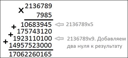После того, как были реализованы операции сложения и вычитания, перешли к написанию операции умножения, которую выполняет метод proisvedenie (BigInteger, BigInteger). Также в его основе лежит принцип умножения «столбиком». Выбираем одно из больших чисел, и поэтапно умножаем числа из каждого разряда этого большого числа, на другое большое число. В результате на каждом шаге у нас получаются «промежуточные» большие числа, суммируя которые с помощью описанного выше метода summa (BigInteger, BigInteger) мы получаем необходимый нам результат. При этом не забываем в зависимости от разряда множителя «добивать» начальные разряды «промежуточных» больших чисел нулями. Как и в предыдущих операциях при поразрядном перемножении в результат мы записываем остаток от деления на 10 и, если результат поразрядного перемножения больше либо равен 10, то на следующем шаге перемножения мы прибавляем число равное целой части от деления предыдущего результата на 10. Также для ускорения процесса перемножения были выделены особые случаи – умножение на 0 и на 1. Пример перемножения двух больших чисел представлен на рисунке 5.