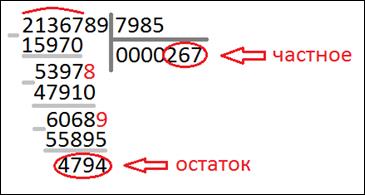 Ход алгоритма следующий: сравниваем делитель с делимым, прибавляя поразрядно по одной цифре к делителю в случае, если получившийся делитель меньше делимого, при этом в частное записываем 0. На рисунке 8 видно этот этап: 2<7985, в частное записываем 0, затем 21<7985, в частное записываем 0, и так далее пока не поменяется знак неравенства 21367>7985. После этого запускается цикл по нахождению следующей цифры частного. На каждом шаге делитель прибавляется на величину равную самому делителю, пока он не станет больше либо равен нашему промежуточному делимому, т.е. 21367. Шаг цикла, на котором выполнится данное условие, и будет искомой цифрой для частного. Затем вычитаем из промежуточного делимого полученное в ходе цикла число и получаем промежуточный остаток. Так как он точно меньше делителя (в связи с предыдущими условиями), добавляем к нему следующую не задействованную цифру делимого и переходим к первому шагу алгоритма. Алгоритм считается выполненным, если получается остаток, меньший делителя и не осталось ни одной незадействованной цифры делимого. В зависимости от задачи, метод возвращает либо частное, либо остаток от деления.