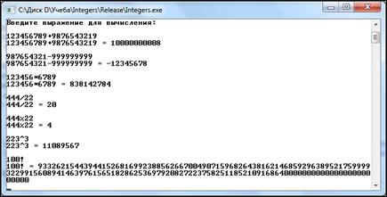 Для удобства пользователей был введен еще один метод vishislenie(), который предоставляет возможность выполнять вышеперечисленные арифметические операции с двумя или одним большим числом путем простого ввода необходимого для вычисления выражения. Пример работы данного метода приведен на рисунке 9.