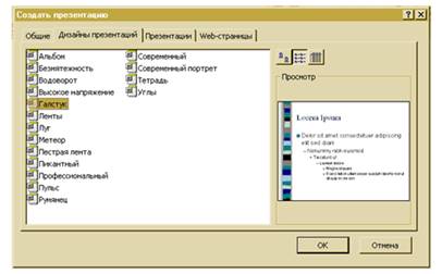 Ещё один способ создания презентации – использование шаблона оформления. В этом случае слайды будут оформлены в одном определённом стиле, но форма представления информации на каждом из слайдов может быть произвольной. Для того, чтобы воспользоваться одним из шаблонов оформления, необходимо выбрать переключатель шаблон презентации и щёлкнуть по кнопкеОК .