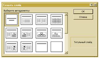 После того, как будет выбран нужный дизайн, можно выбрать и одну из стандартных разметок слайда. Щелчок по кнопке ОК откроет следующее диалоговое окно, в котором и выбирают требуемую разметку.