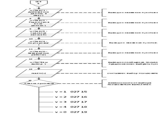 4: sort; {если пользователь ввел "4", то вызываем процедуру сортировки файла} 0: knc := true; {если пользователь ввел "0", то устанавливаем признак окончания программы в значение истина}