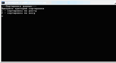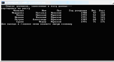 Данная функция предоставляет пользователю сортировать имеющиеся в базе данные выбирая критерии сортировки: по росту или по весу.